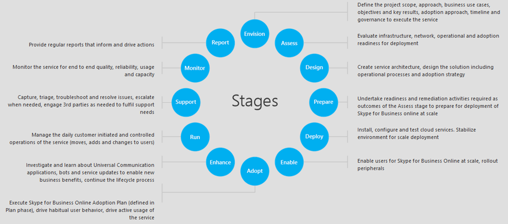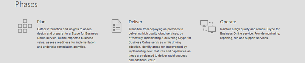 In addition, FastTrack is the customer success service design to help customer move to Office 365, smoothly and with confidence. It covers planning, deployment and adoption aspects of the customer lifecycle. FastTrack best practices, tools, and resources associated with Skype for Business are based on SOF. SOF extends FastTrack with guidance for ongoing operational management, and provides additional Skype-specific details for planning and deployment. All Office 365 customers should utilize FastTrack for planning, deployment, and adoption, and should follow SOF throughout the lifecycle of Skype for Business deployments. In addition, customers should consider using partner managed service offerings built on SOF for elements not covered by FastTrack, including ongoing operations, and, when needed, other workload specific activities.