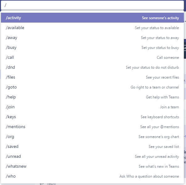 Como pueden observar tenemos algunos comandos para cambiar nuestra presencia en el cliente de teams, asi que en lugar de realizar esto de la manera habitual