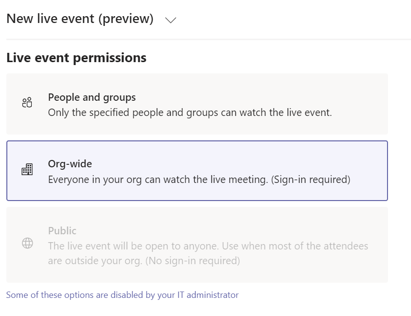 La opción de un evento Público si se muestra, pero no es posible selccionarla. Adicional, vemos un aviso de que algunas de estas opciones estan deshabilitadas por tu administrador de IT.