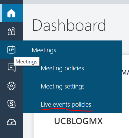 Y nos vamos a la seccion de Meetings, y damos clic en Live events policies