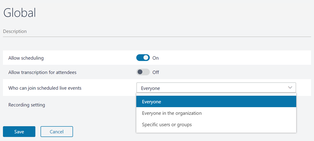Nos mostrara que solo tenemos una politica, que es la Global. Vamos a abrir sus propiedades y vamos a seleccionar en Who can join scheduled live events –> Everyone y vamos a salvar la configuracion.