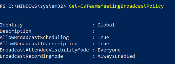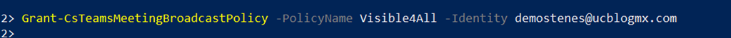 Grant-CsTeamsMeetingBroadcastPolicy –PolicyName Visible4All –Identity user@domain.com