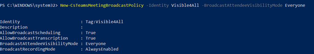 New-CsTeamsMeetingBroadcastPolicy –Identity Visible4All –BroadcastAttendeeVisibilityMode Everyone
