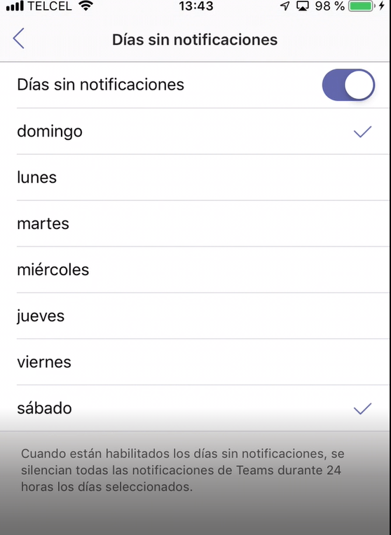 Y en la parte final podemos ver que dice días sin notificaciones, aquí podemos seleccionar cuales dias vamos a dejar sin notificaciones las 24 hrs. Por defecto tenemos sabado y domingo, para mi ejemplo así lo voy a dejar.
