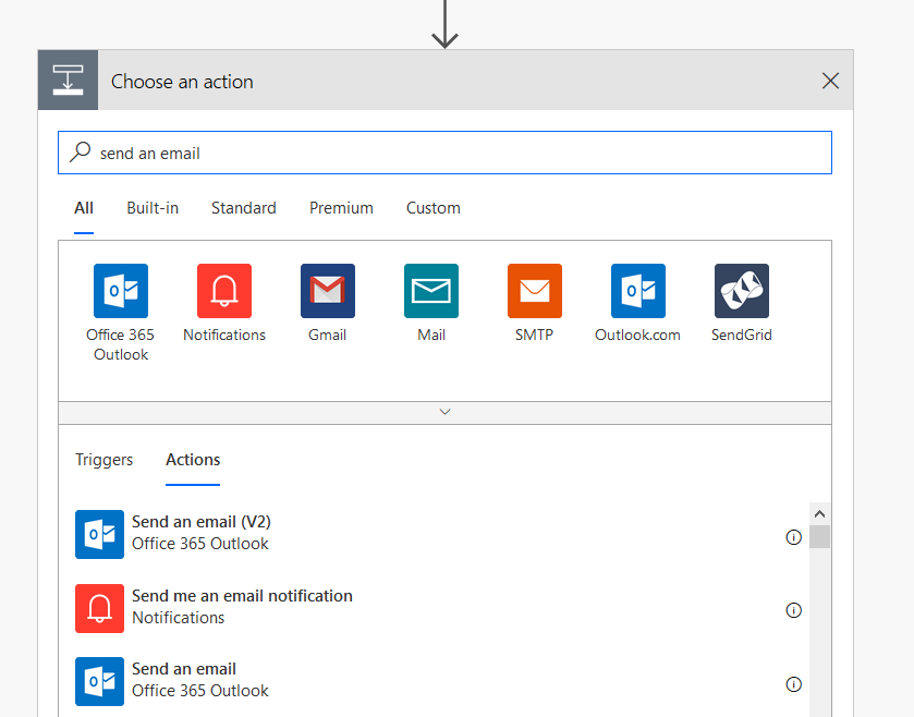 Damos clic en el botón de + para agregar una nueva acción, escribimos en la barra de busqueda “Send an email” y seleccionamos la acción con el mismo nombre.