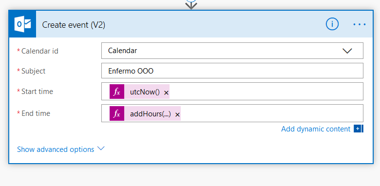 Para start time y End Time , usaremos las expresiones. utcnow – que es el tiempo de ese instante, y para endtime addhours, y ya podremos agregar cuantas horas durara el evento.