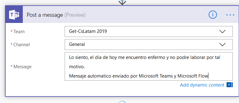 Seleccionamos “Post a Message” y llenamos los campos de acuerdo al Team y Canal donde queremos que el mensaje sea enviado, y tambien podemos configurar el mensaje a nuestro gusto.