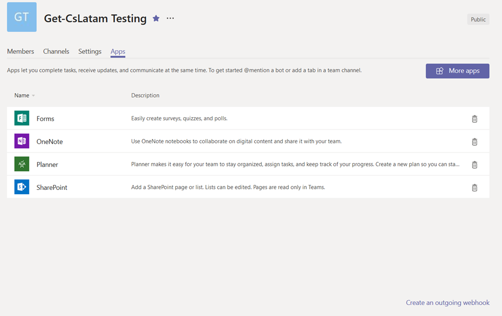 Despues nos vamos al tab Apps, y en la parte inferior derecha vamos a ver “Create an outgoing webhook” damos clic