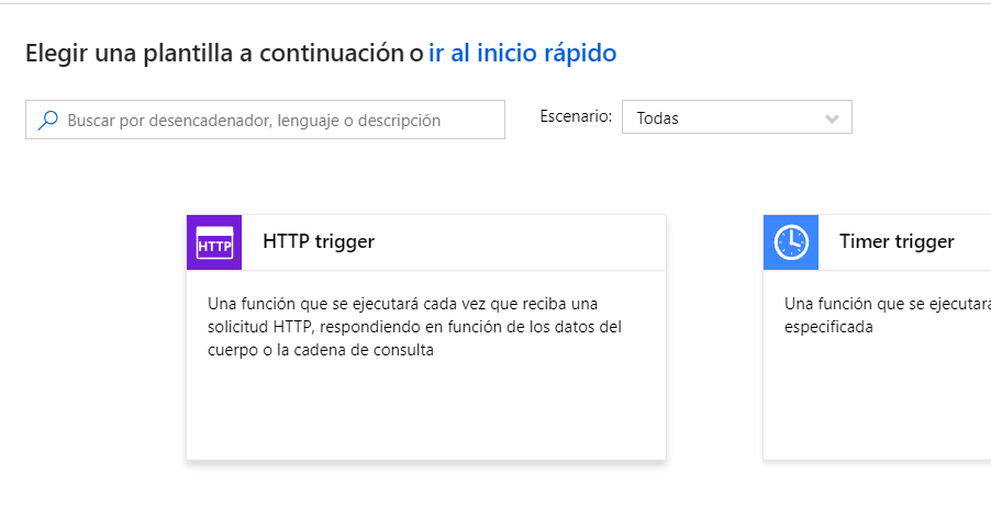 Ya que esta creada, y la abrimos. Vamos a elegir una plantilla. en este caso será un HTTP Trigger (igual que se hizo en Teams)