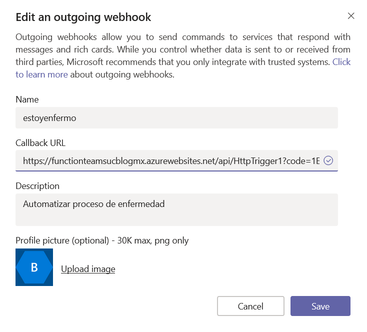 Recuerdan que les mencione que se modificaria el Callback URL del Webhook, entonces ya que tenemos la URL de la Function App, vamos a agregarla a nuestro Webhook.