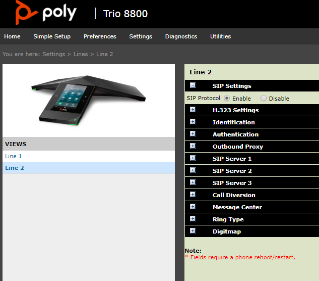 Ingresamos nuevamente al webUI del Poly Trio (https://IPAddress) y nos vamos a Settings > Lines. Donde ahora podrán ver que tienen la opción de la segunda línea.