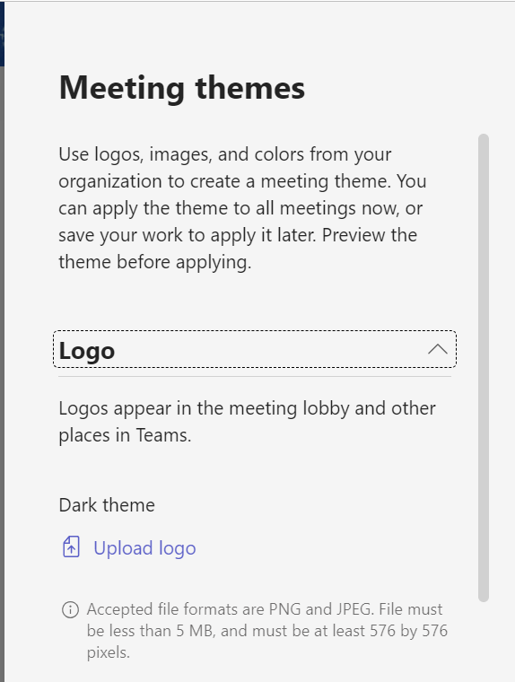 The logo will appear in the meeting lobby and other places in Microsoft Teams. The accepted formats for this logo are:
