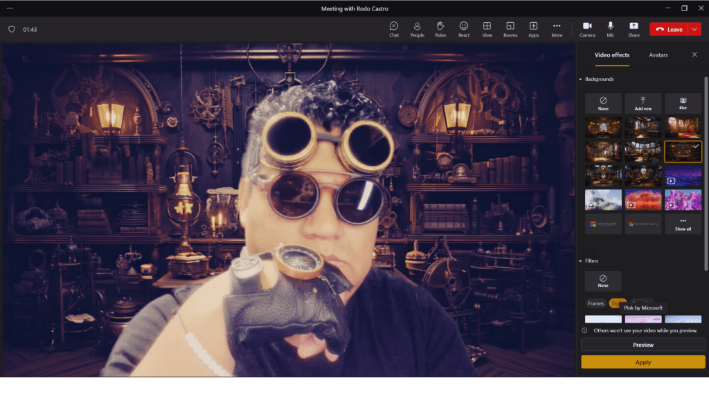 Now, since we enter the meeting with one of my users with an assigned license, we can see that he has the 8 backgrounds that we have defined for him and he can use them, in order to be consistent with the Steampunk theme, in the same way you can see that the buttons and options continue to retain the color you had defined.