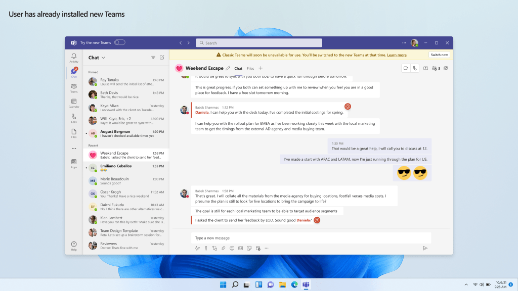 – Implementación administrada por Administración: los administradores pueden elegir controlar la nueva implementación de Teams, como se describe en Actualizar a los nuevos Equipos mediante directivas. Estas directivas ya no funcionarán a comienzos de abril, excepto los usuarios de VDI, y se producirán los siguientes cambios: Los nuevos equipos se convertirán en el cliente predeterminado. El botón de alternancia para volver a la versión clásica de Teams seguirá estando disponible si es necesario. A mediados de mayo, se instalará nuevo Teams y el botón de alternancia para volver a la versión clásica de Teams ya no estará disponible. Intentaremos desinstalar Teams clásico, actualmente después de un período de 14 días.